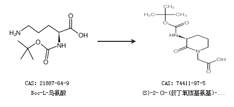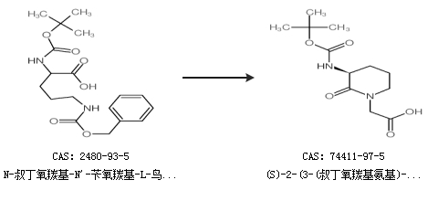 1.通过N-叔丁氧羰基-N''-苄氧羰基-L-鸟氨酸合成(S)-2-(3-(叔丁氧羰基氨基)-2-氧代哌啶-1-基)乙酸