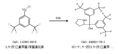 1.通过3,5-双(三氟甲基)苯基溴化镁合成(S)-α,α-双[3,5-双(三氟甲基)苯基]-2-吡咯烷甲醇,收率约53%;