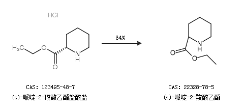 2.通过(s)-哌啶-2-羧酸乙酯盐酸盐合成(s)-哌啶-2-羧酸乙酯,收率约64%;