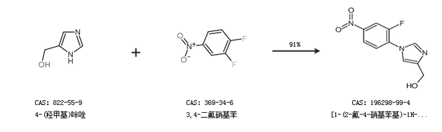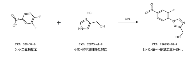 1.通过4-(羟甲基)咪唑和3,4-二氟硝基苯合成[1-(2-氟-4-硝基苯基)-1H-咪唑-4-基]甲醇,收率约91%;