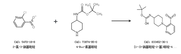 1.通过2-氯-3-硝基吡啶和4-Boc-氨基哌啶合成[1-(3-硝基吡啶-2-基)哌啶-4-基]氨基甲酸叔丁酯