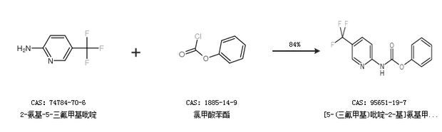 1.通过2-氨基-5-三氟甲基吡啶和氯甲酸苯酯合成[5-(三氟甲基)吡啶-2-基]氨基甲酸苯酯,收率约84%;