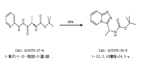 1.通过1-氧代-1-(2-(吡啶-2-基)肼)丙烷-2-基氨基甲酸-(R)-叔丁酯合成1-([1,2,4]噻唑o[4,3-a]吡啶-3-基)乙基氨基甲酸-(R)-叔丁酯,收率约68%;