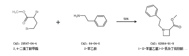 1.通过2,4-二溴丁酸甲酯和2-苯乙胺合成1-(2-苯基乙基)-2-氮杂丁烷羧酸甲酯,收率约58%;