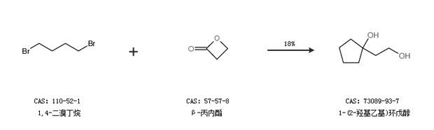 1.通过1,4-二溴丁烷和β-丙内酯合成1-(2-羟基乙基)环戊醇,收率约18%;