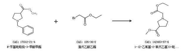 1.通过N-苄基吡咯烷-3-甲酸甲酯和溴代乙酸乙酯合成1-(2-乙氧基-2-氧代乙基)3-吡咯烷甲酸甲酯