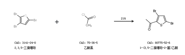 2.通过2,3,5-三溴噻吩和乙酰氯合成1-(3,5-二溴噻吩-2-基)乙酮,收率约21%;