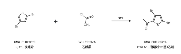 1.通过2,4-二溴噻吩和乙酰氯合成1-(3,5-二溴噻吩-2-基)乙酮,收率约91%;