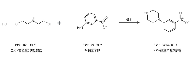 2.通过二(2-氯乙基)胺盐酸盐和3-硝基苯胺合成1-(3-硝基苯基)哌嗪,收率约45%;