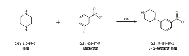 1.通过哌嗪和间氟硝基苯合成1-(3-硝基苯基)哌嗪,收率约74%;