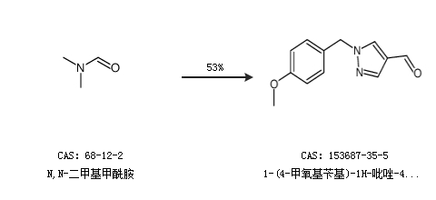 1.通过N,N-二甲基甲酰胺合成1-(4-甲氧基苄基)-1H-吡唑-4-甲醛,收率约53%;