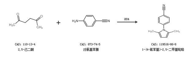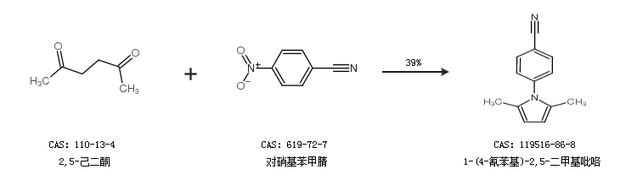 2.通过2,5-己二酮和对硝基苯甲腈合成1-(4-氰苯基)-2,5-二甲基吡咯,收率约39%;