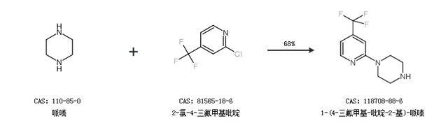 1.通过哌嗪和2-氯-4-三氟甲基吡啶合成1-(4-三氟甲基-吡啶-2-基)-哌嗪,收率约68%;