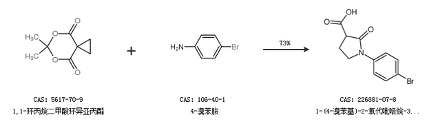 2.通过1,1-环丙烷二甲酸环异亚丙酯和4-溴苯胺合成1-(4-溴苯基)-2-氧代吡咯烷-3-羧酸,收率约73%;