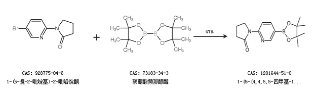 1.通过1-(5-溴-2-吡啶基)-2-吡咯烷酮和联硼酸频那醇酯合成1-(5-(4,4,5,5-四甲基-1,3,2-二噁硼烷-2-基)吡啶-2-基)吡咯烷-2-酮,收率约47%;