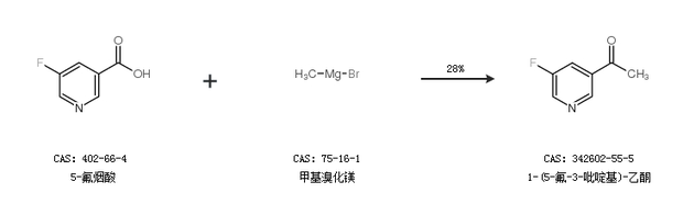 1.通过5-氟烟酸和甲基溴化镁合成1-(5-氟-3-吡啶基)-乙酮,收率约28%;