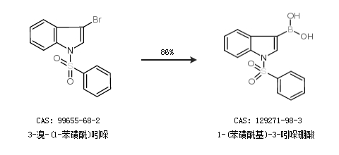 1.通过3-溴-(1-苯磺酰)吲哚合成1-(苯磺酰基)-3-吲哚硼酸,收率约86%;