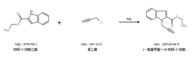 2.通过吲哚-2-羧酸乙酯和氯乙腈合成1-(氰基甲基)-1H-吲哚-2-羧酸乙酯,收率约75%;