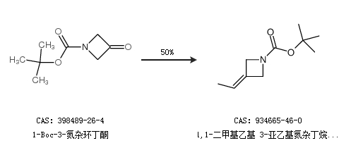 2.通过1-Boc-3-氮杂环丁酮合成1,1-二甲基乙基 3-亚乙基氮杂丁烷-1-羧酸,收率约50%;