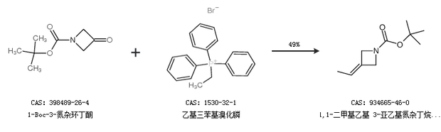 1.通过1-Boc-3-氮杂环丁酮和乙基三苯基溴化膦合成1,1-二甲基乙基 3-亚乙基氮杂丁烷-1-羧酸,收率约49%;