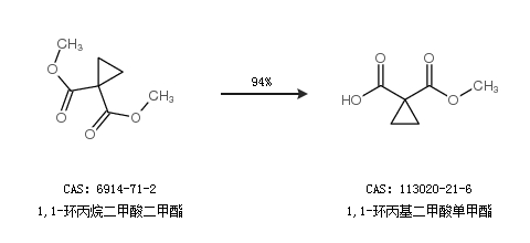 1.通过1,1-环丙烷二甲酸二甲酯合成1,1-环丙基二甲酸单甲酯,收率约94%;