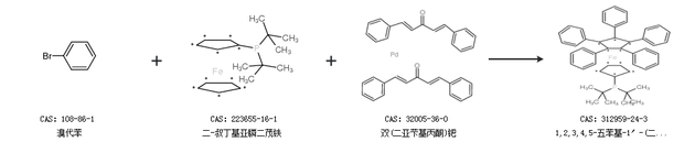 2.通过溴代苯、二-叔丁基亚膦二茂铁和双(二亚芐基丙酮)钯合成1,2,3,4,5-五苯基-1′-(二叔丁基膦)二茂铁