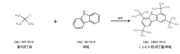 2.通过氯代叔丁烷和咔唑合成1,3,6,8-四(叔丁基)咔唑,收率约92%;