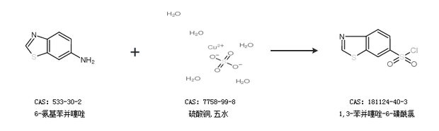 1.通过6-氨基苯并噻唑和硫酸铜,五水合成1,3-苯并噻唑-6-磺酰氯
