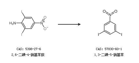 1.通过2,6-二碘-4-硝基苯胺合成1,3-二碘-5-硝基苯,收率约93%;
