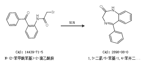 1.通过N-(2-苯甲酰苯基)-2-溴乙酰胺合成1,3-二氢-5-苯基-1,4-苯并二氮杂卓-2-酮,收率约91%;
