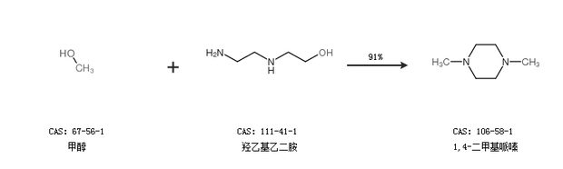 2.通过甲醇和羟乙基乙二胺合成1,4-二甲基哌嗪,收率约91%;