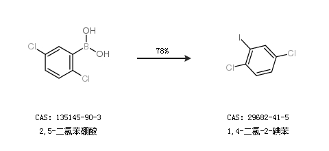 1.通过2,5-二氯苯硼酸合成1,4-二氯-2-碘苯,收率约78%;