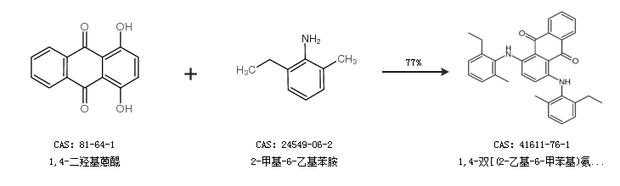 1.通过1,4-二羟基蒽醌和2-甲基-6-乙基苯胺合成1,4-双[(2-乙基-6-甲苯基)氨基]蒽醌,收率约77%;