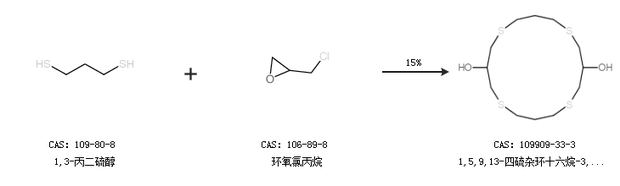 1.通过1,3-丙二硫醇和环氧氯丙烷合成1,5,9,13-四硫杂环十六烷-3,11-二醇,收率约15%;