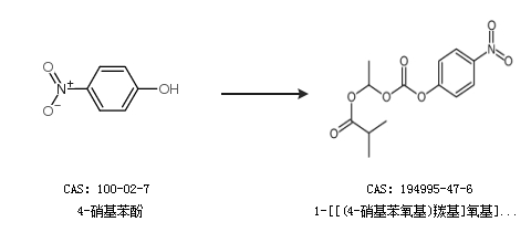 1.通过4-硝基苯酚、1-氯乙基氯甲酸酯和异丁酸合成1-[[(4-硝基苯氧基)羰基]氧基]-2-甲基丙酸乙酯,收率约58%;