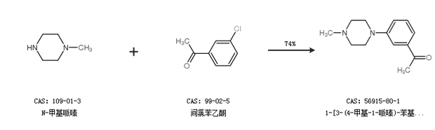 1.通过N-甲基哌嗪和间氯苯乙酮合成1-[3-(4-甲基-1-哌嗪)-苯基]-乙酮,收率约74%;