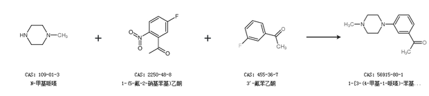 2.通过N-甲基哌嗪、1-(5-氟-2-硝基苯基)乙酮和3''-氟苯乙酮合成1-[3-(4-甲基-1-哌嗪)-苯基]-乙酮