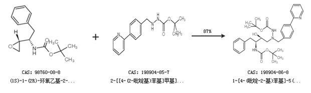 1.通过(1S)-1-(2R)-环氧乙基-2-苯乙基氨基甲酸叔丁酯和2-[[4-(2-吡啶基)苯基]甲基]-肼羧酸-(1,1-二甲基)乙酯合成1-[4-(吡啶-2-基)苯基]-5(S)-2,5-双 [(叔丁基氧基羰基)–氨基]-4(S)-羟基l-6-苯基-2-氮杂己烷,收率约87%;
