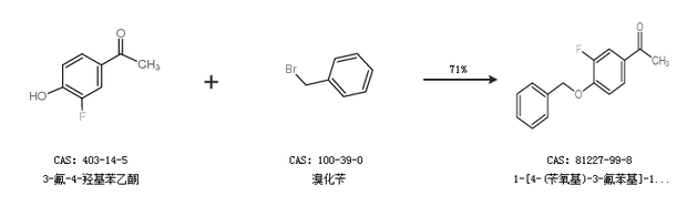 1.通过3-氟-4-羟基苯乙酮和溴化苄合成1-[4-(苄氧基)-3-氟苯基]-1-乙酮,收率约71%;