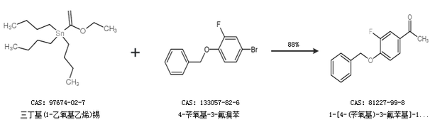 2.通过三丁基(1-乙氧基乙烯)锡和4-苄氧基-3-氟溴苯合成1-[4-(苄氧基)-3-氟苯基]-1-乙酮,收率约88%;