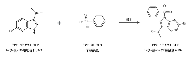 1.通过1-(6-溴-1H-吡咯并[2,3-B]吡啶-3-基)-乙酮和苯磺酰氯合成1-[6-溴-1-(苯磺酰基)-1H-吡咯并[2,3-b]吡啶]-乙酮,收率约88%;
