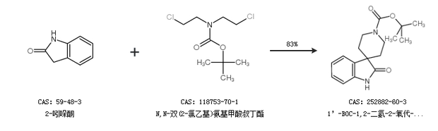 2.通过2-吲哚酮和N,N-双(2-氯乙基)氨基甲酸叔丁酯合成1’-BOC-1,2-二氢-2-氧代-螺[3H-吲哚-3,4’-哌啶],收率约83%;