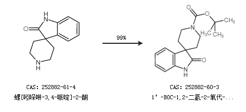 1.通过螺[吲哚啉-3,4-哌啶]-2-酮合成1’-BOC-1,2-二氢-2-氧代-螺[3H-吲哚-3,4’-哌啶],收率约99%;
