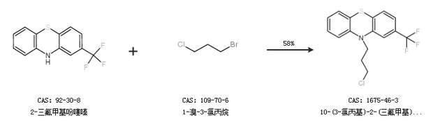 1.通过2-三氟甲基吩噻嗪和1-溴-3-氯丙烷合成10-(3-氯丙基)-2-(三氟甲基)-10H-吩噻嗪,收率约58%;