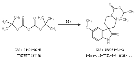 1.通过二碳酸二叔丁酯合成1-Boc-1,2-二氢-5-甲氧基-2-氧代-螺[3H-吲哚-3,4-哌啶],收率约69%;