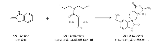 2.通过2-吲哚酮和N,N-双(2-氯乙基)氨基甲酸叔丁酯合成1-Boc-1,2-二氢-5-甲氧基-2-氧代-螺[3H-吲哚-3,4-哌啶]