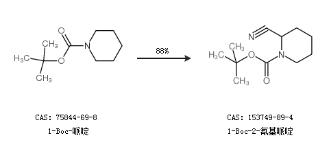 2.通过1-Boc-哌啶合成1-Boc-2-氰基哌啶,收率约88%;