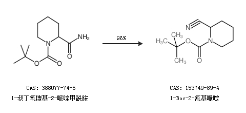 1.通过1-叔丁氧羰基-2-哌啶甲酰胺合成1-Boc-2-氰基哌啶,收率约96%;