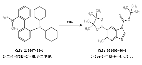 2.通过2-二环己膦基-2''-(N,N-二甲胺)-联苯合成1-Boc-5-甲基-6-(4,4,5,5-四甲基-1,3,2-二噁硼烷-2-基)-1H-苯并咪唑,收率约50%;