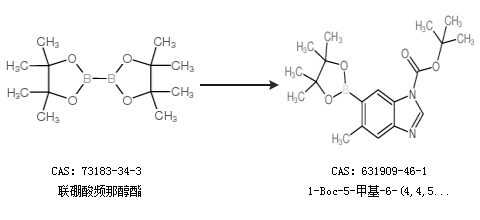 1.通过联硼酸频那醇酯合成1-Boc-5-甲基-6-(4,4,5,5-四甲基-1,3,2-二噁硼烷-2-基)-1H-苯并咪唑
